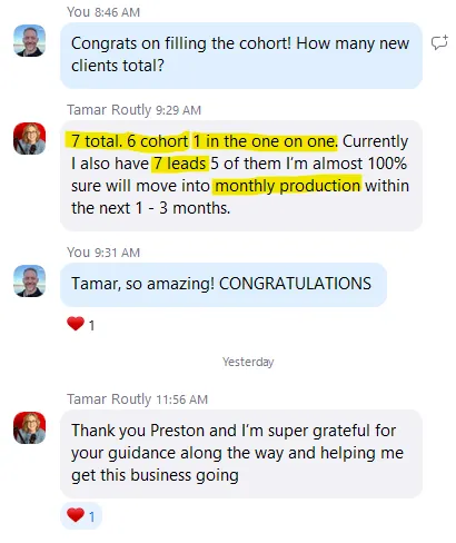 Tamar R. signed 7 new clients in Edge Accelerator with 7 more in the pipeline by week 6.