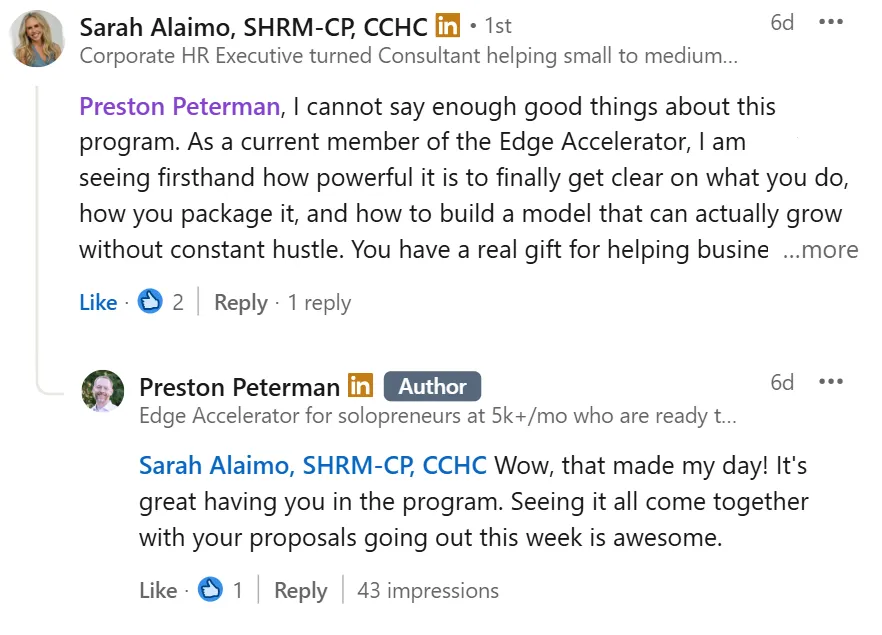 She already had an amazing website and plan. Was doing some freelance and project work on the side. But she wasn't monetizing her side business and it was costing her. No freedom and optionality. She launched her new service with Edge Accelerator and locked-in. Hello momentum. It works, if you work it.